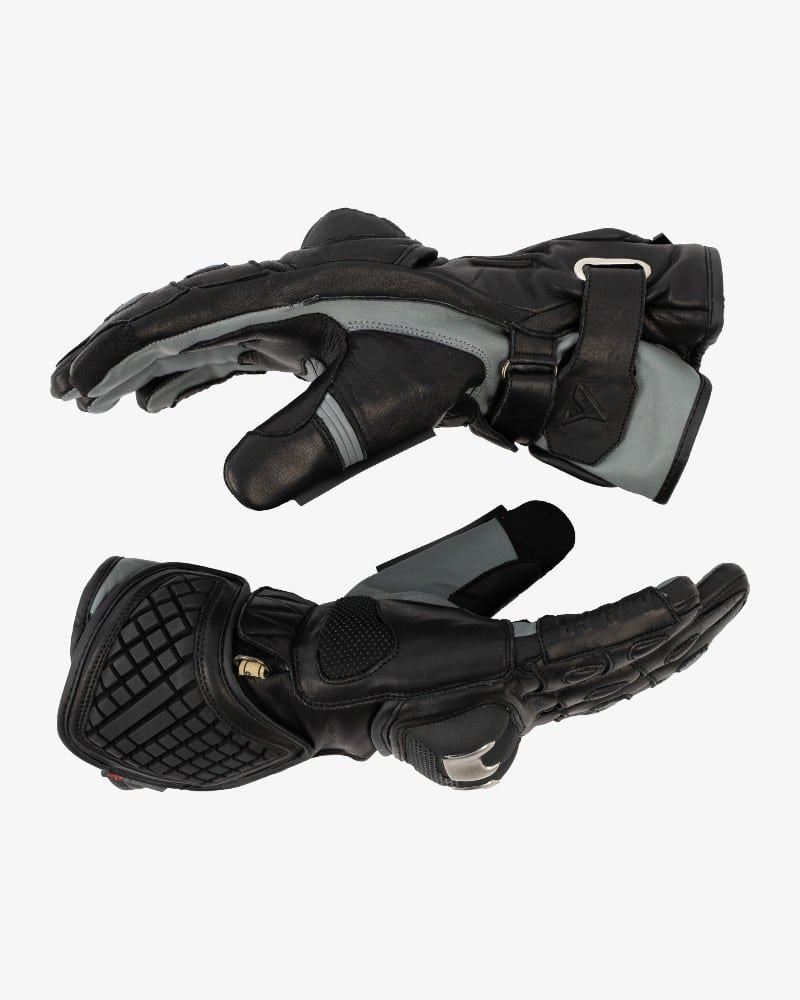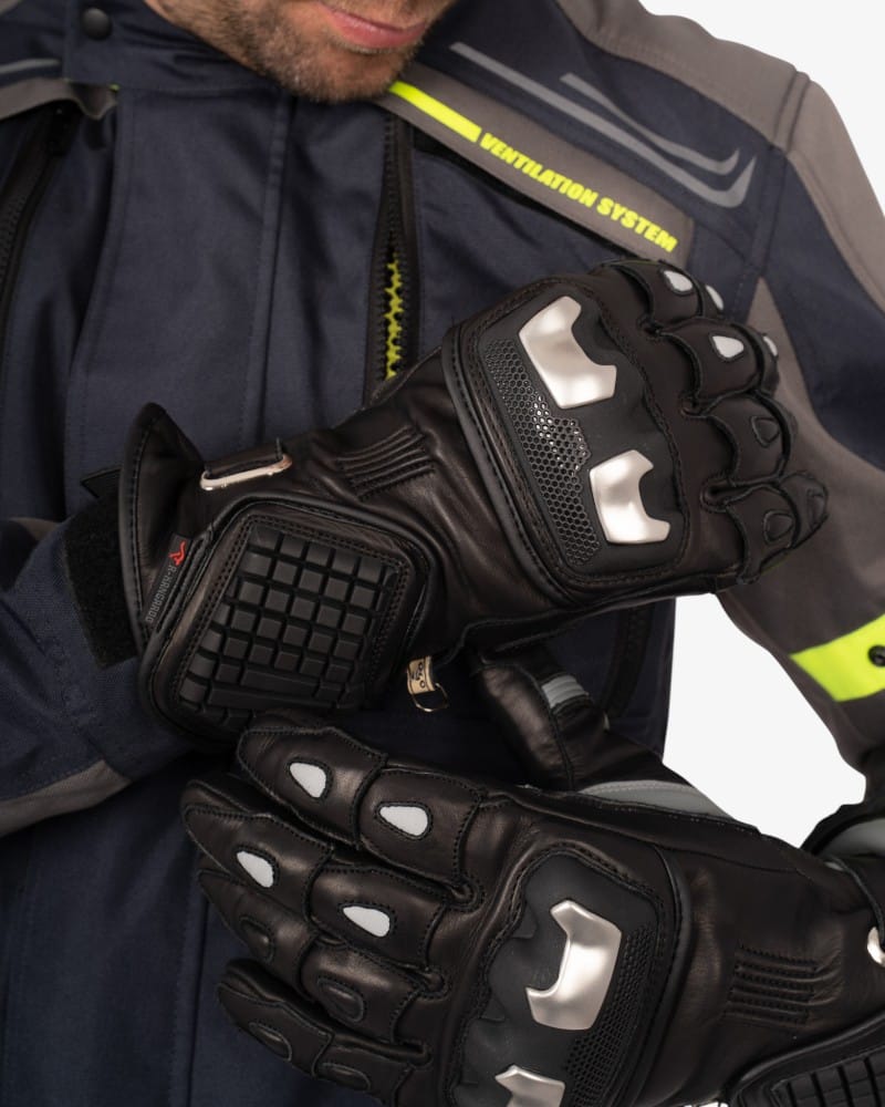 Incorporan refuerzos antiabrasión de aramida en la palma, mejorando la resistencia en las zonas de mayor contacto, junto con elementos semirrígidos de protección lateral que aumentan la seguridad frente a impactos. El diseño con fuelle en dedos y dorso proporciona mayor libertad de movimiento y confort durante la conducción.
